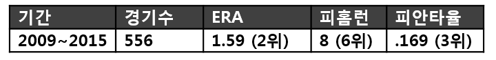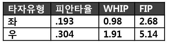 표1. 랜디 초트의 좌타자 상대 성적 (해당기간 100이닝 이상 소화기준)
