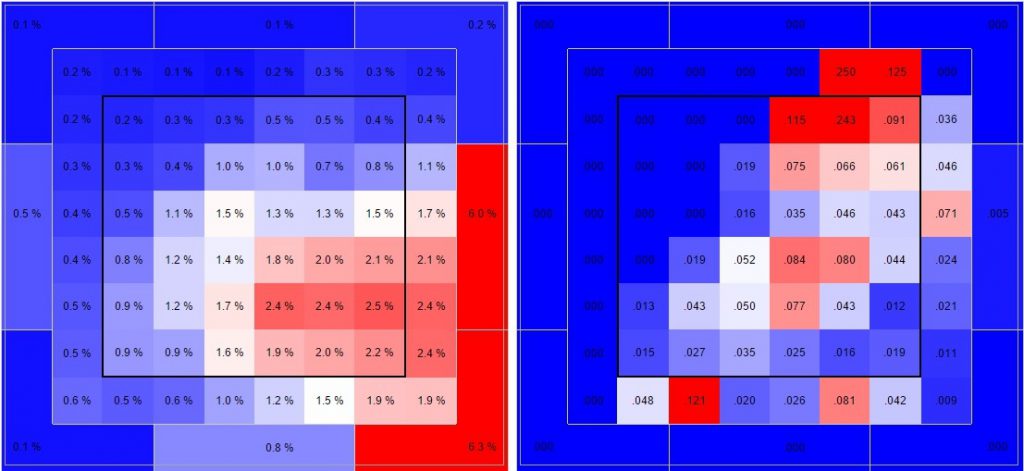 그림1. 초트의 좌타자 상대 슬라이더 분포도(좌)와 피안타율(우) (투수시점)