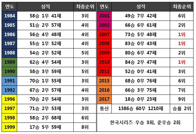 프로야구 원년, 김성근 감독은 야구 선배인 OB 베어스 김영덕 감독 아래에서 투수코치를 맡아 한국시리즈 우승을 이끌었고 1984년에는 감독으로 승격되었다. 감독 첫 해부터 팀을 전/후기 통합 승률 1위로 올린 김 감독은 1986년과 1987년에도 2년 연속 포스트시즌 진출에 성공한다.
