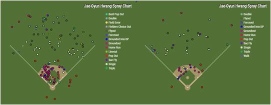 5월까지만 해도 황재균의 당겨 친 타구가 가장 빈번하게 향한 곳은 유격수 방면이었다. 전체 타구 중 1/3에 육박하는 31.8%의 타구가 유격수와 3루수 방면을 향했고, 좌익수 방면으로 날아간 타구는 전체 타구의 13.9%에 불과했다. 반면, 타격자세에 변화를 준 6월 이후로는 좌익수 방면의 타구가 24.1%로 가장 높은 비중을 차지했다. 대신 유격수와 3루수 방면의 타구가 18.5%로 확연한 감소세를 보였다. 당겨 친 타구가 훨씬 높은 확률로 내야를 넘어 빠져나가기 시작했다는 것이다. 그리고 메이저리그 데뷔 첫 홈런 역시 왼쪽 담장을 크게 넘기며 이러한 변화를 증명했다.