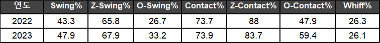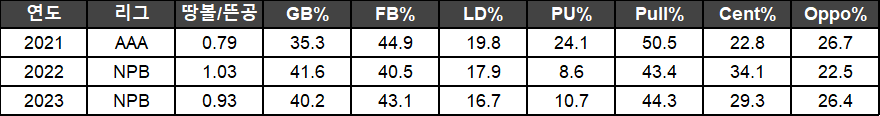 KBO리그는 트리플 A, NPB에 비하면 평균 구속이 느리다. 변화구의 완성도 역시 아직 두 리그에 비해 다소 낮은 편이다. 따라서 본인의 존을 빠르게 파악한다면 바깥쪽 공의 공략법을 찾을 수 있다. 약점이 옅어지면서 강점인 파워가 두드러질 가능성이 충분하다.