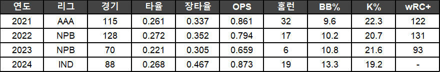 다만 맥브룸은 삼진을 많이 당하는 타자는 아니다. 트리플 A 통산 K%는 23.1%(3시즌), NPB 21.0%(2시즌)로 평균 수준이다. 볼넷 비율도 트리플 A 통산 9.5%, NPB 10.4%로 중상위권이다. 거포형 타자이기 때문에 선구와 컨택 능력이 다소 부족할 순 있지만, 걱정할 정도까지의 수준은 아니다.