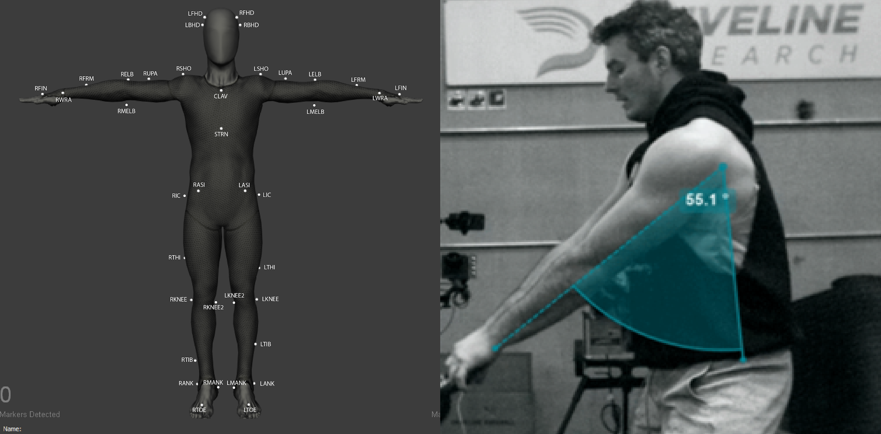 < 36개의 관절점으로 이루어진 OpenBiomechanics의 관절점 구조(좌)와 시각화된 관절 각도 데이터(우) >