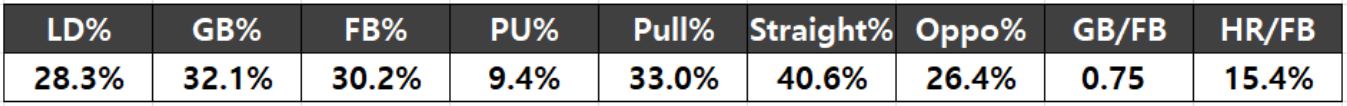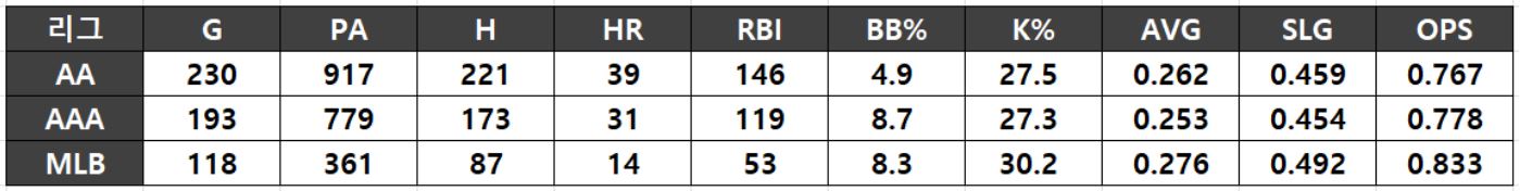 또한 MLB 통산 라인드라이브 타구 비율(LD%)도 MLB 평균(24.7%)을 웃도는 28.3%를 기록했다. 양질의 타구는 홈런이 9개로 줄었음에도 AAA에서보다 높은 장타율을 기록하는 데 이바지했다.