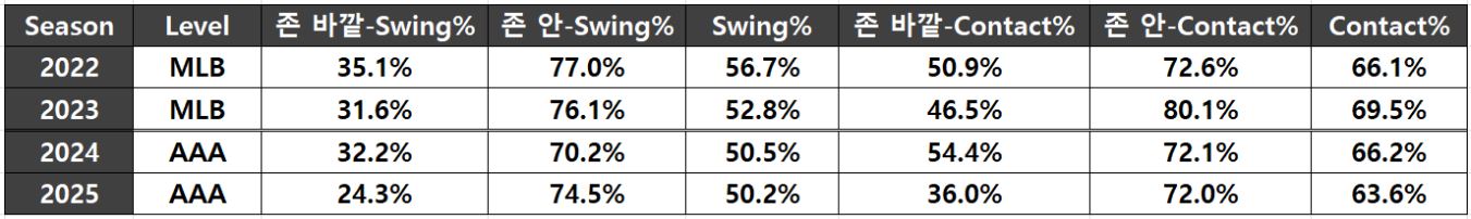 < MLB, AAA 시즌별 스윙/컨택 관련 지표 >