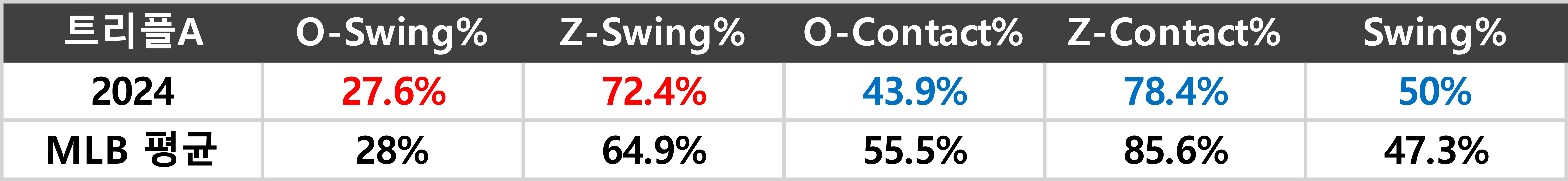 하지만 컨택 능력이 이를 받쳐주지 못했다. 트리플 A에서 컨택률은 70%에 근사한 수치를 기록했다. 2024년엔 69.1%로 70%를 넘지 못했다. 낮은 컨택 능력은 결국 삼진으로 귀결됐다. 트리플 A 통산 K% 약 24.3%를 기록했다. 엄청 높은 수치는 아니지만 파워 히터가 아닌 점을 감안했을 땐 다소 아쉬운 성적이다.