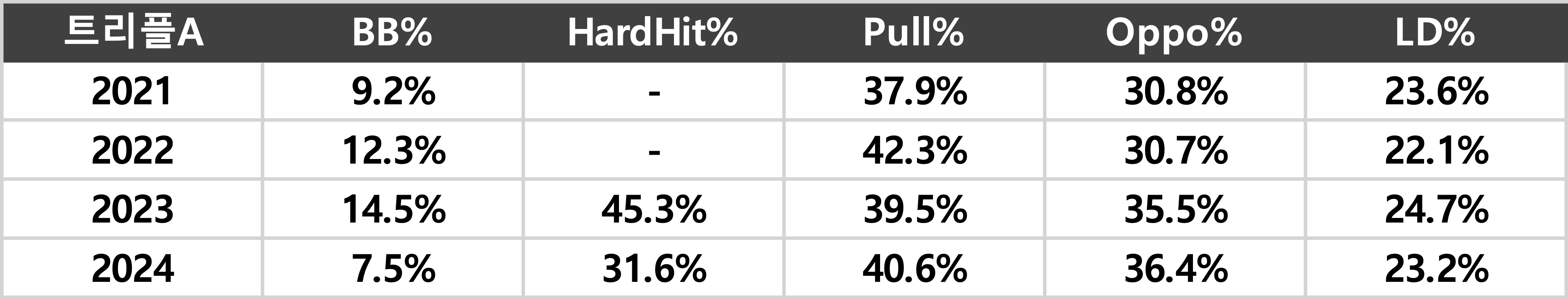 당겨친 비율도 40% 내외를 기록했다. 2024년에는 당겨친 비율과 밀어친 비율이 약 4.2%밖에 차이 나지 않았다. 극단적으로 당겨치거나 뜬공을 생산해 홈런을 치는 유형이 아닌 빠른 배트 스피드를 바탕으로 구장 곳곳에 강한 타구를 보내 2, 3루타를 생산하는 갭 히터 유형이다.