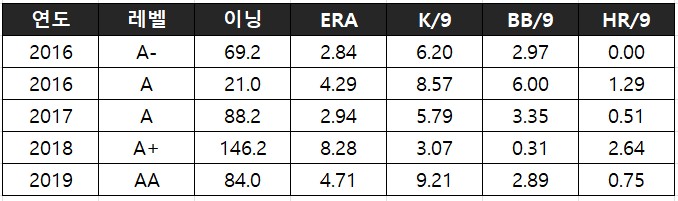 < 2016 ~ 2019년 머피 마이너리그 기록(10이닝 이하 제외) >