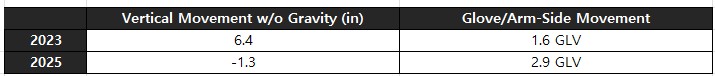 긴 이닝을 소화하면서 해당 구속을 유지했다는 점도 플러스 요소다. 실제로 트리플 A에서 마지막으로 5이닝 이상을 소화했던 경기(2023년 9월 26일)에서 싱커의 평균 구속은 95.6마일, 포심의 평균 구속은 95.7마일에 육박했다.
