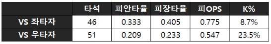 결국 관건은 좌타자 상대 승부다. 체인지업을 지금 당장 주무기로 사용하기는 힘들 것이다. 돌파구는 슬라이더라고 생각한다. 2023년 좌타자를 상대로 19.3%의 K%를 기록할 당시에는 커브(탈삼진 22개)와 포심(탈삼진 13개)으로 재미를 보았다. 그러나 앞서 보았듯 커브는 제구가 망가졌고 포심은 투구폼을 바꾼 이후 타자를 압도하지 못하고 있다. 올해 성적이 좋았던 슬라이더의 비율을 늘리는 것이 해결책이 될 수 있을 것이라 생각한다.