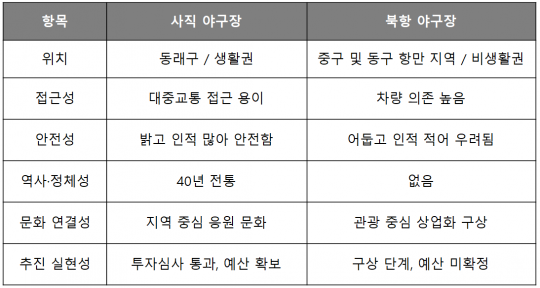 사직 야구장 재건축과 아시아드 주경기장 리모델링 비용을 고할 때 북항 바다 야구장 건립이 합리적이라는 의견도 있다. 하지만 해양 환경에 따른 추가 비용은 무시할 수 없다.