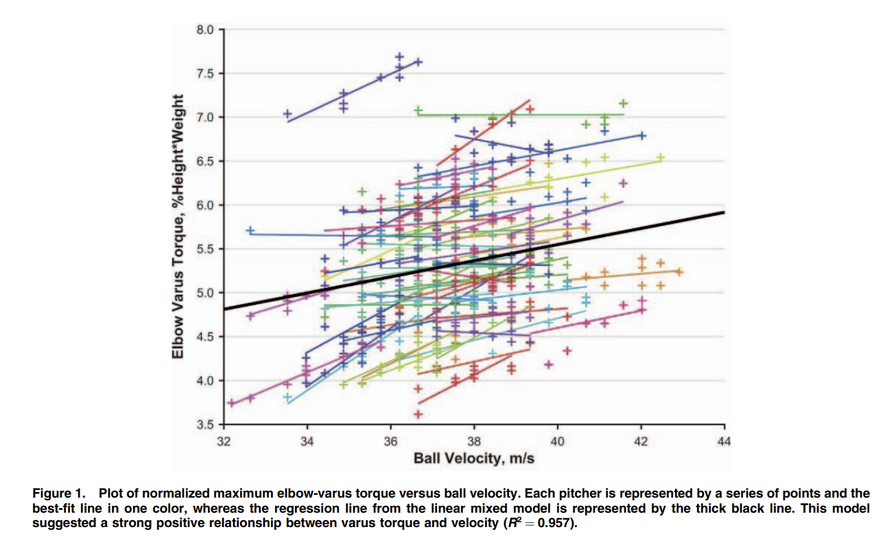 위 그림을 보면, 모든 투수들에게서 자신이 던지는 공의 구속을 높일수록 팔꿈치에 가해지는 부하가 증가하는 경향이 나타난다. 반면 구속이 높음에도 구속이 낮은 투수보다 팔꿈치에 가해지는 부하가 적은 투수도 존재한다.