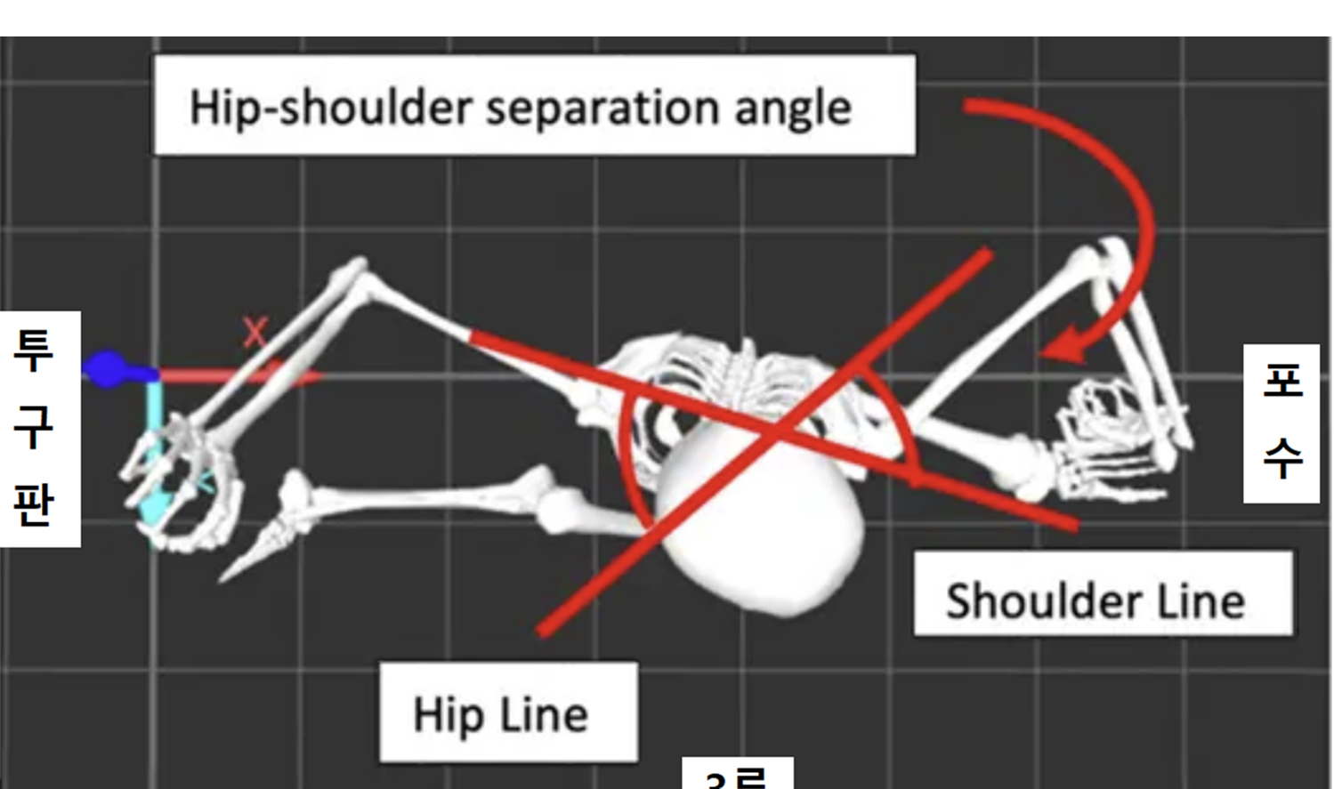 위 그림을 보면, 골반(엉덩이)은 포수 쪽으로 회전하고 상체는 골반보다 적게 회전하여 상·하체 분리가 나타난다. 어깨를 이은 선(shoulder line)과 골반의 양 끝을 이은 선(Hip line)이 이루는 각(상·하체 분리각)을 통해 상·하체 분리의 정도를 직관적으로 가늠할 수 있다. 각이 클수록 상·하체 분리가 많이 일어난다.