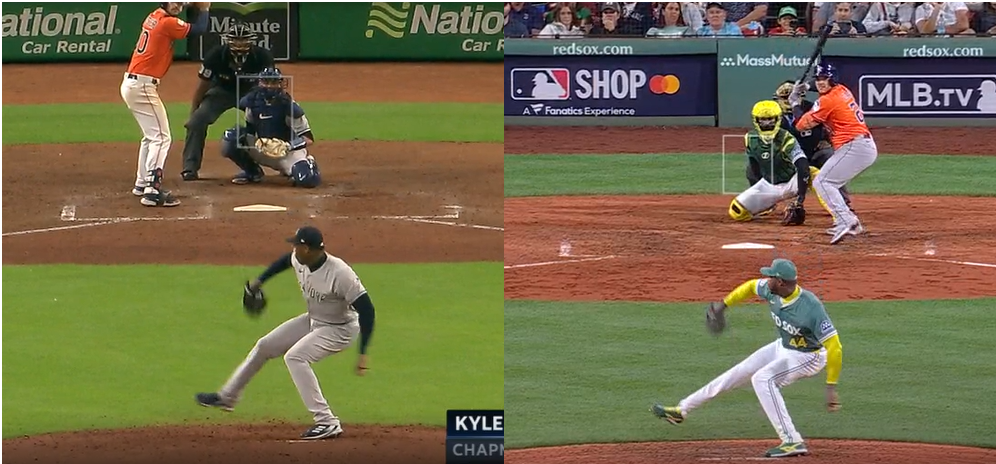 < 아롤디스 채프먼의 2021시즌(왼쪽), 2025시즌(오른쪽)의 모습. 2025시즌에는 뒤로 더 걸터앉고 상체를 더 2루 쪽으로 틀며(양어깨가 더 2루 쪽으로 향하고 있다.) 하체의 활용도를 늘리는 모습이다. >