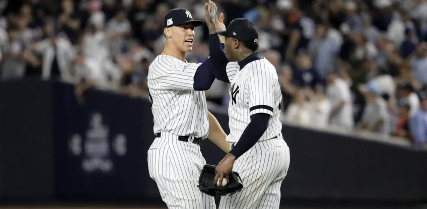 < 애런 저지와 채프먼이 하이파이브 하는 모습. 10cm에 달하는 키 차이에도 채프먼의 다리 길이가 애런 저지의 다리 길이와 거의 비슷하다. >
