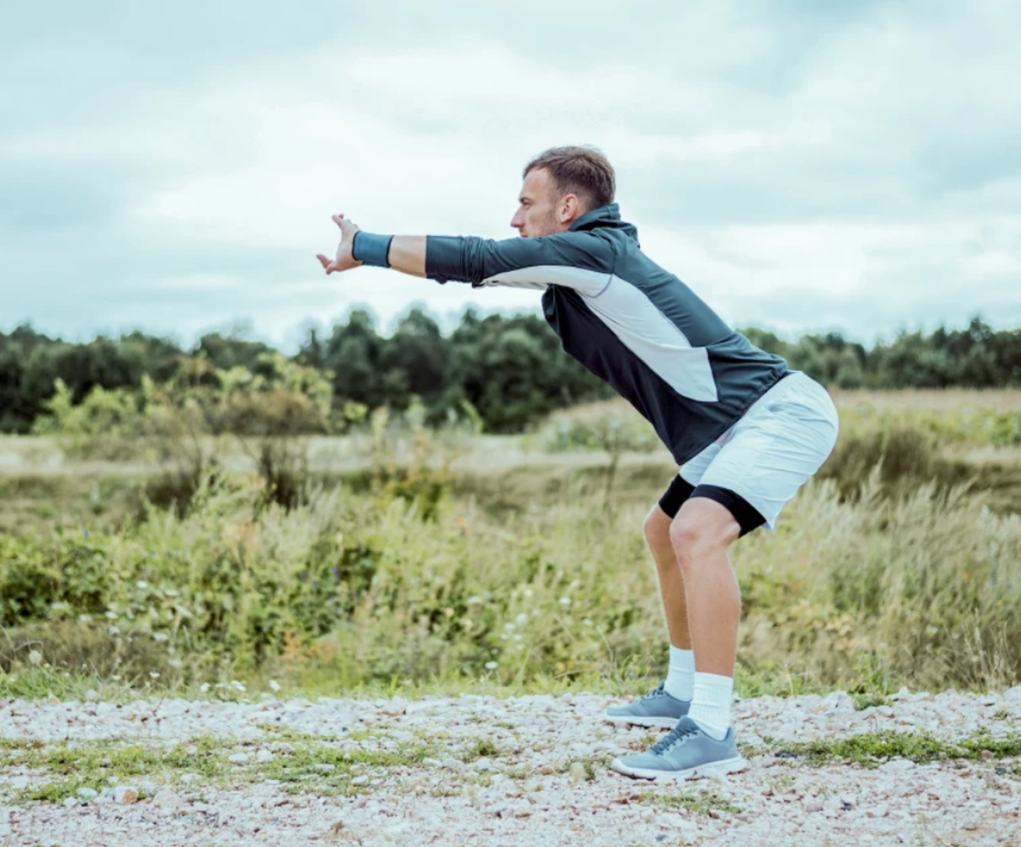 < 힙 힌치 동작의 정석. 마치 뒤에 걸터앉는 것처럼 엉덩이를 뒤로한 채 무릎은 발보다 앞으로 나가지 않게 하는 것이 포인트이다. >