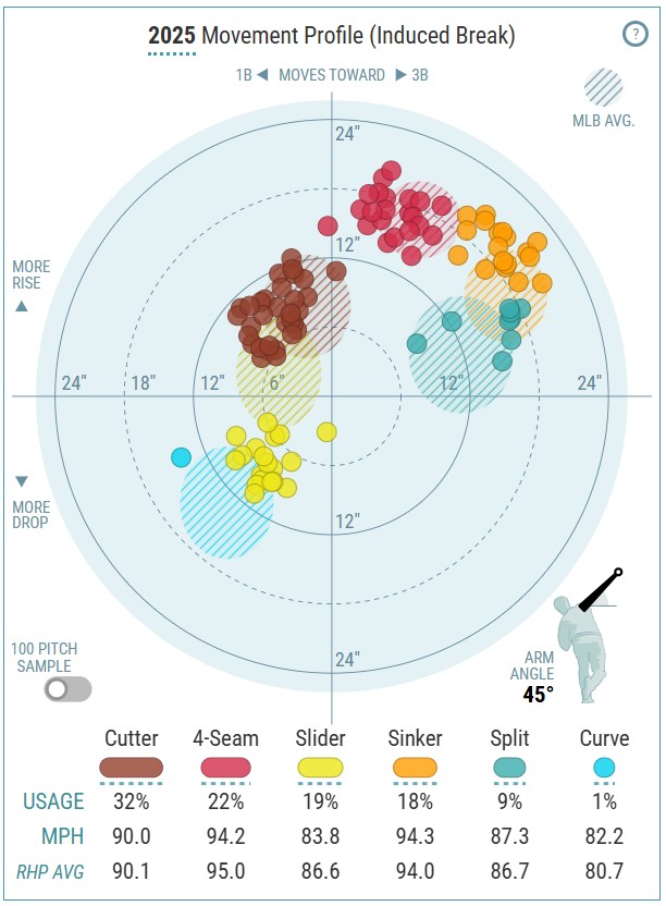 슬라이더 또한 위력적이다. 2024년 스카우팅 리포트에서 55점을 받으며 포심과 함께 리그 평균 이상의 구종으로 평가받았다. 요즘 트렌드인 스위퍼처럼 횡 무브먼트가 돋보이지는 않지만 거의 커브에 가까운 종 무브먼트를 가졌다. 효과는 대단했다. 트리플 A에서 우타자 상대 Hard Hit%가 8.3%에 불과했고 단 한 개의 배럴 타구도 허용하지 않았다.