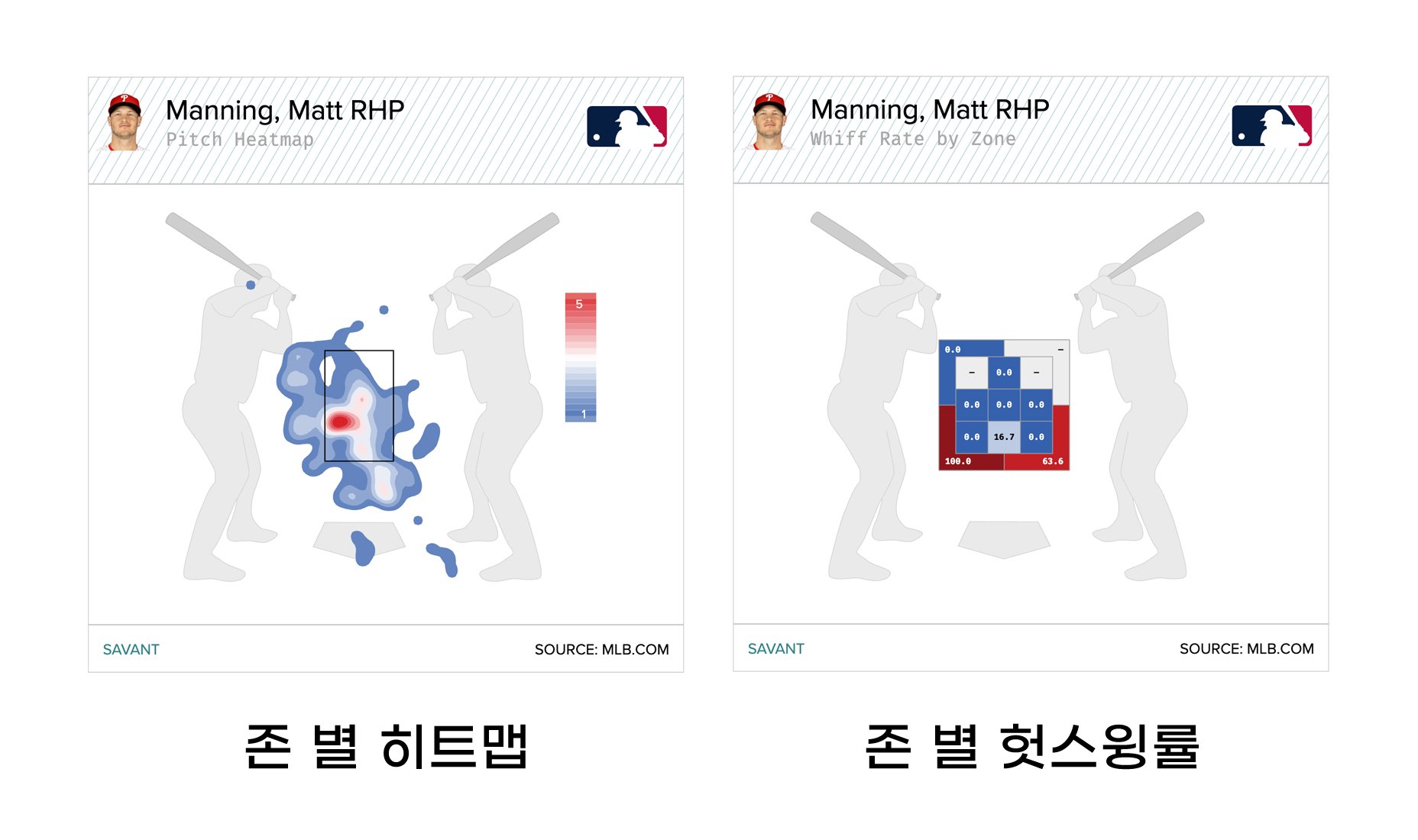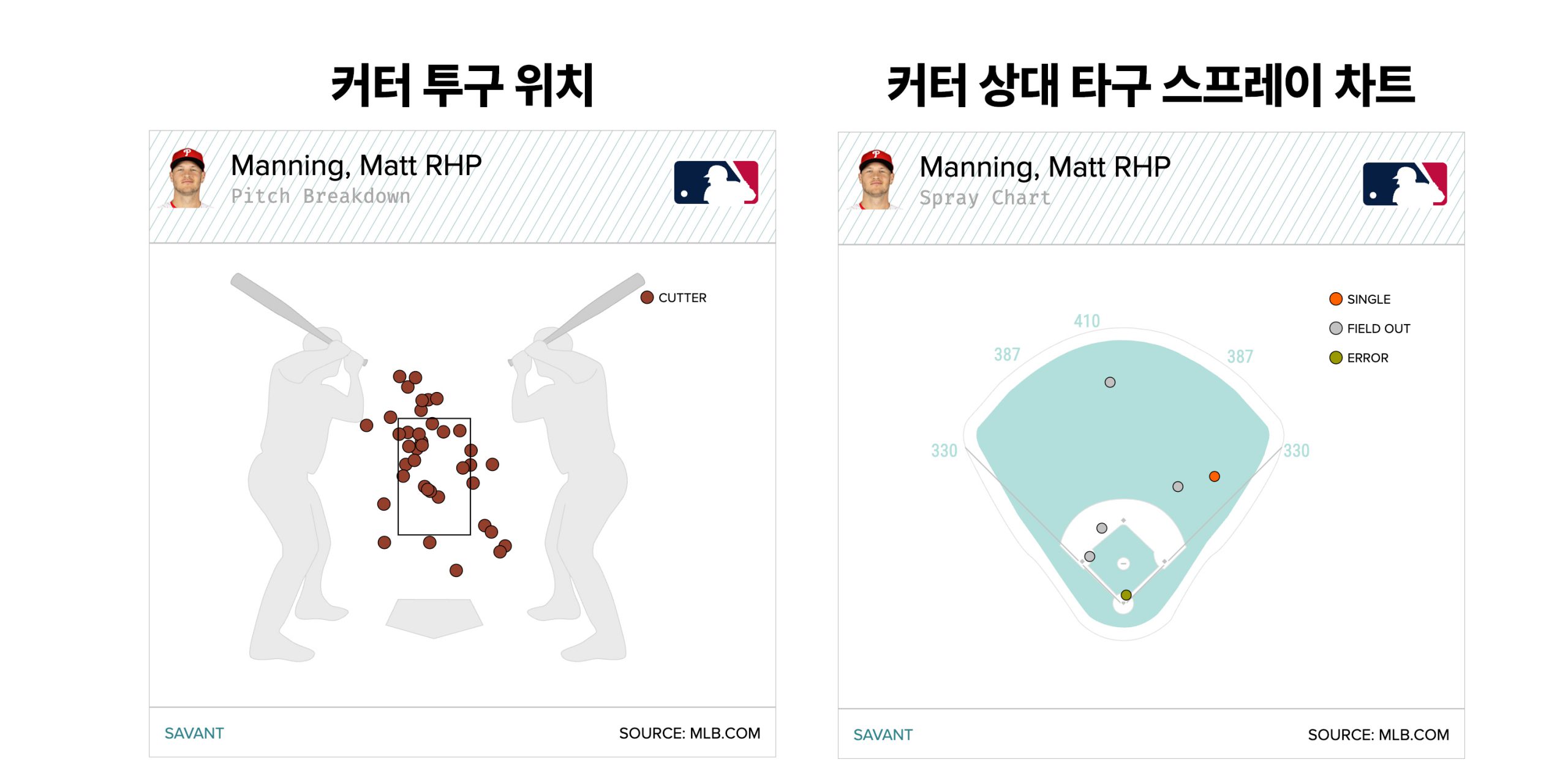매닝은 스트라이크를 던질 줄 아는 투수다. 빅리그에서도 Zone%(스트라이크 존 투구 비율)는 리그 평균을 상회했다. 즉 컨트롤은 나쁘지 않다. 하지만 문제는 커맨드다. 스트라이크 존 안에 공을 넣을 수는 있다. 하지만 원하는 곳에 던지는 것은 기대하기 힘들다.