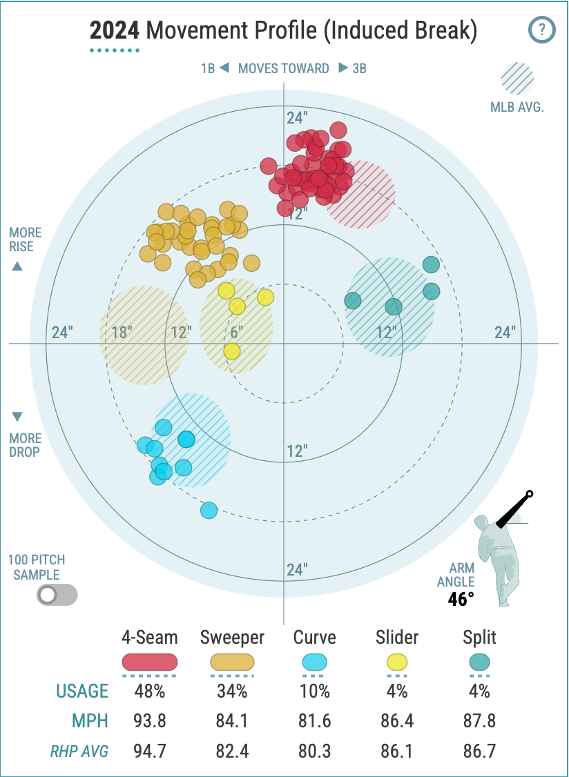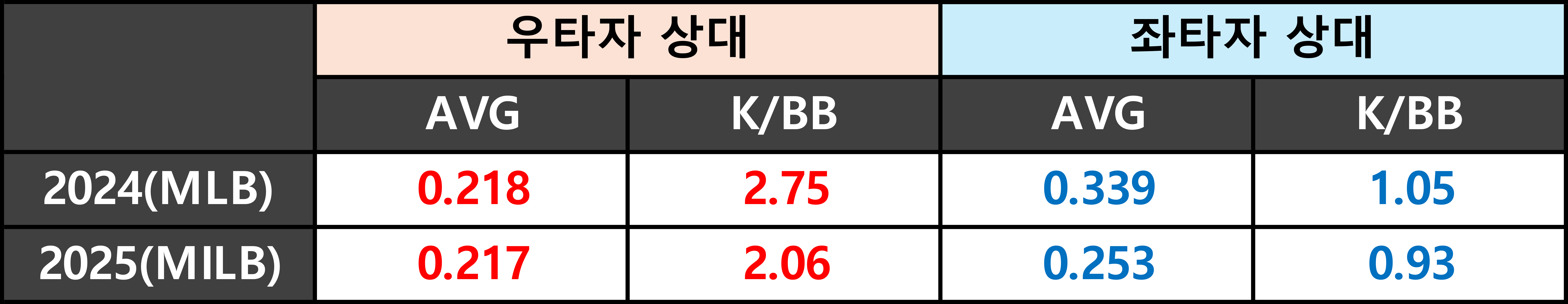 하지만 커브는 제구 문제를 가지고 있다. 불안한 커브는 구사율이 높지 않다. 그마저도 대부분을 반대 손 타자인 좌타자를 상대할 때 던진다. 2025년 트리플 A에서는 커브가 존으로 몰렸고, 결국 헛스윙을 끌어내지 못했다. 전체 커브 헛스윙률은 25%가 되지 않았다. (평균 헛스윙률 약 30%)