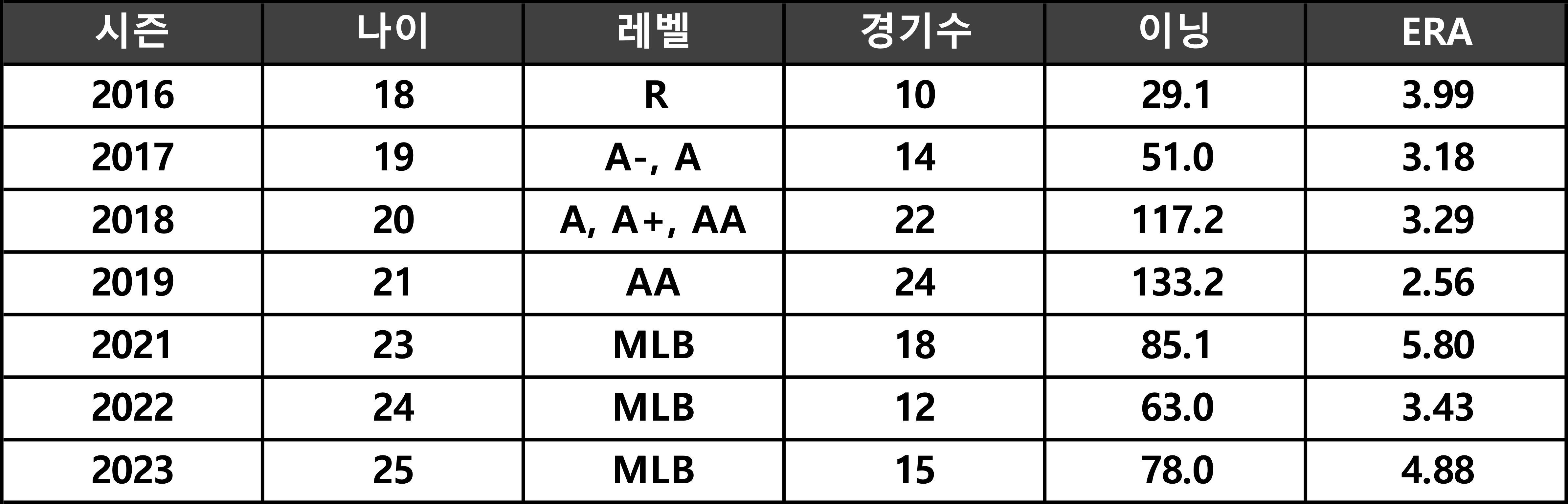 이후 매닝의 성장은 정체됐다. 2024시즌 메이저리그에서 자리를 잡지 못하고 마이너리그를 오가는 ‘AAAA급 투수’ 신세가 됐다. 2025년엔 메이저리그 진입도 못 했다. 빅리그 통산 45경기 226.1이닝 11승 14패 ERA 4.58. 지명 순위를 생각하면 아쉬운 성적표였다. 이제 더 이상 유망주라는 꼬리표가 통하지 않는 20대 후반에 들어섰다. 이에 매닝은 정체된 커리어의 돌파구를 찾기 위해 한국행 비행기에 몸을 실었다.