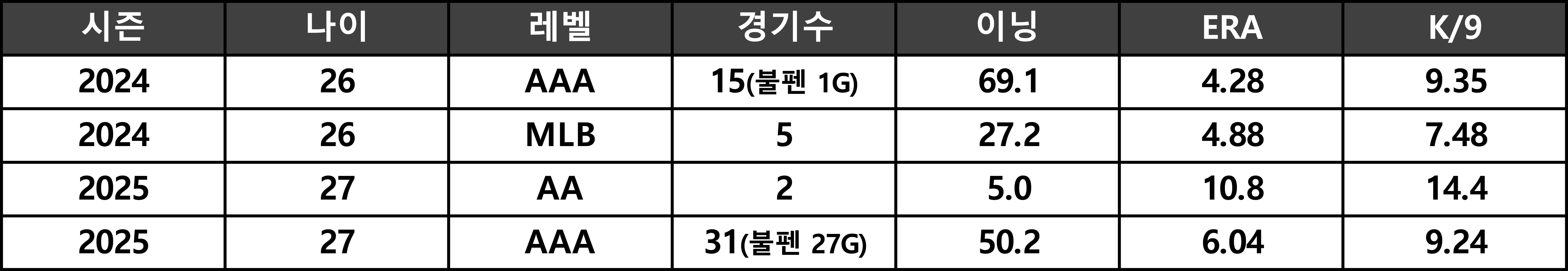 약한 구위의 스위퍼는 트리플 A에서도 통하지 않았다. 2025시즌 31경기 동안 헛스윙률이 25%가 되지 않았다. 빅리그 선수들의 변화구 평균 헛스윙률이 약 30%임을 감안하면 아쉬운 수치다.