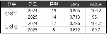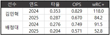 < 2024, 2025시즌 주전 야수 타격 성적 변화 >
