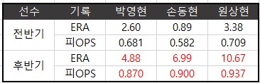 이강철 감독이 KT의 지휘봉을 잡은 이래 많은 필승조 자원이 과한 이닝을 투구해 주된 비판 요소가 되었다. 불펜의 많은 이닝 소화를 온전히 감독 탓으로 돌리긴 어렵지만 올해도 사정은 크게 다르지 않았다. 시작은 좋았다. 시즌 초 원상현 – 손동현 – 박영현으로 이어지는 필승조 라인의 대활약에 힘입어 전반기 불펜 era 3위(3.64)를 기록해 뒷문을 안정적으로 막았다.