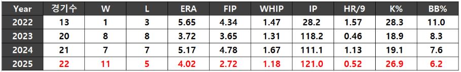 2025시즌 한화는 새로운 구장에서 산뜻한 출발을 했다. 이 흐름을 이어가기 위해선 MLB로 이적한 폰세와 와이스의 공백을 메워야 한다. 한 자리는 만 25세의 젊은 우완 윌켈 에르난데스로 채웠다. 평균 150km/h 이상의 패스트볼과 커리어 내내 주로 선발로 활약한 점은 긍정적이다. 한 자리는 2018년 2라운드 드래프티 오웬 화이트와 계약했다.