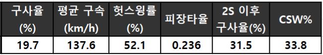 킥 체인지업은 특히 좌타자에게 효과가 컸다. 변화구 중 가장 많이 투구(구사율 24.8%)하며 헛스윙률 48.3%를 기록했다. NPB 시절 주무기였던 슬라이더의 헛스윙률(18.8%)과 비교하면 엄청난 변화다. 150km/h를 웃도는 패스트볼과 킥 체인지업 조합은 타자에게 혼란을 줬다. 그리고 이는 폰세의 압도적인 성적으로 이어졌다.