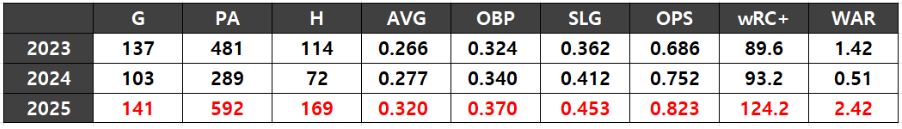 하지만 올해 수비 부담이 적은 좌익수로 자리 잡으며 타격에 집중할 수 있었다. 결과는 성공적이었다. 이번 시즌 141경기 출전해 12홈런 OPS 0.823 wRC+ 124.2를 기록하며 아쉬운 팀 타선에서 단비 같은 역할을 했다.