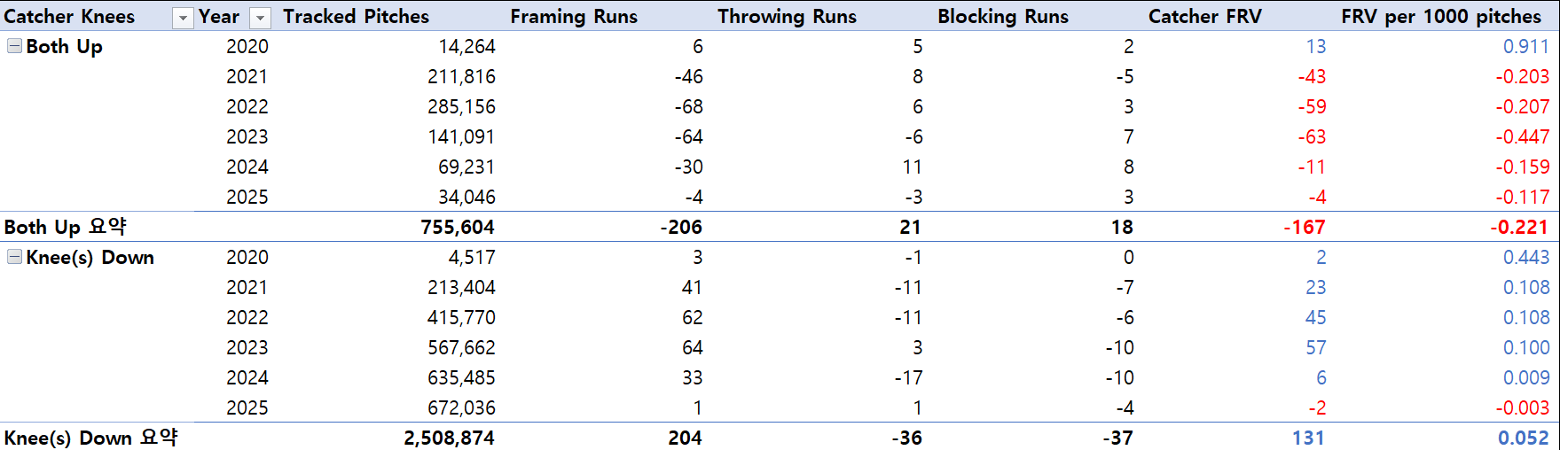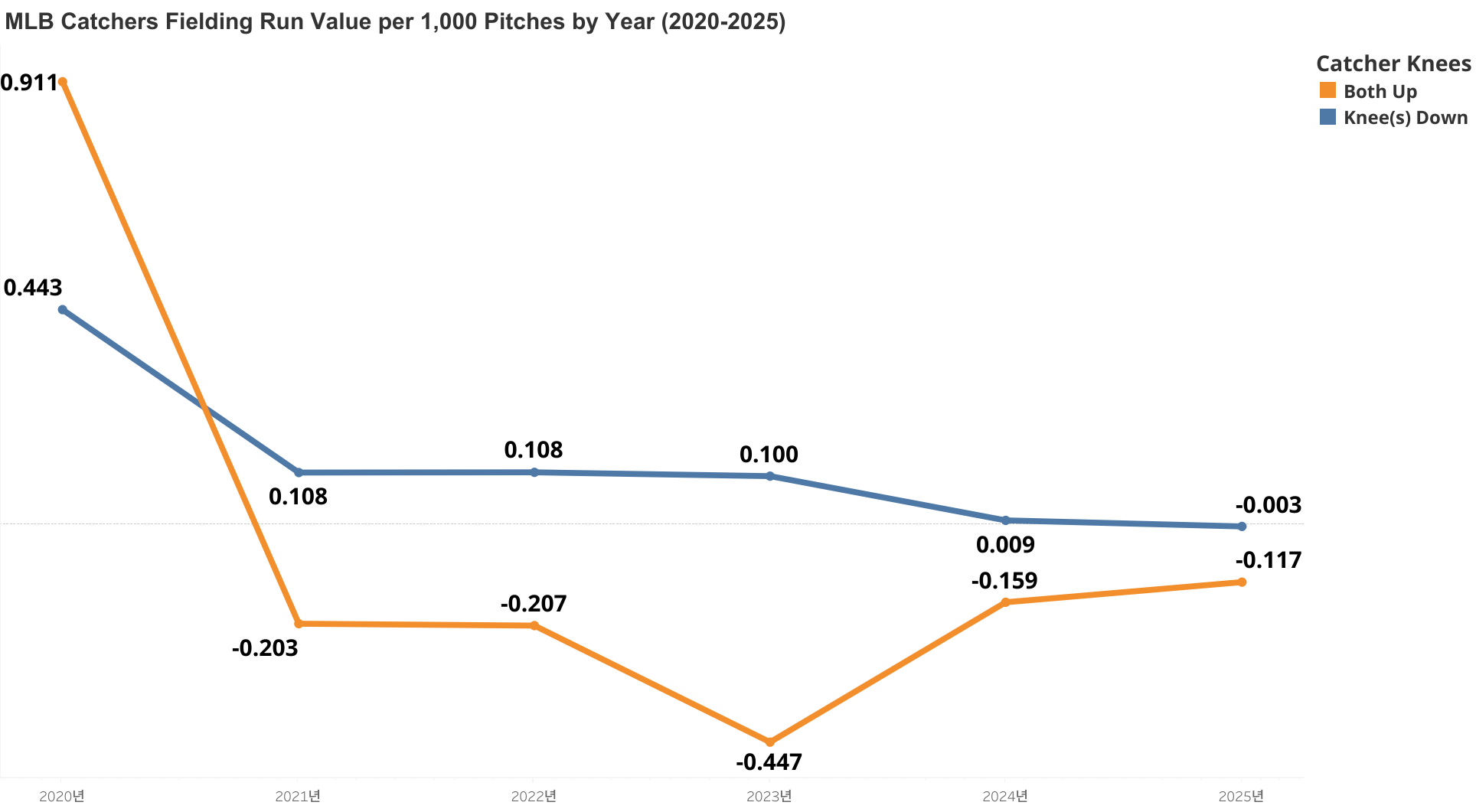 2020년 이후 한 무릎 자세의 FRV는 +131인 반면, 전통 자세의 FRV는 -167을 기록했다. 포구 수 차이를 보정하기 위한 FRV per 1,000 pitches(1,000구당 수비 기여도)도 2020년 이후 한 무릎 자세가 평균 +0.052점, 전통 자세는 −0.221점으로 나타났다. 한 무릎 자세는 매 시즌 1,000개의 투구마다 평균적으로 약 0.27점의 수비 가치 우위를 보인 셈이다.