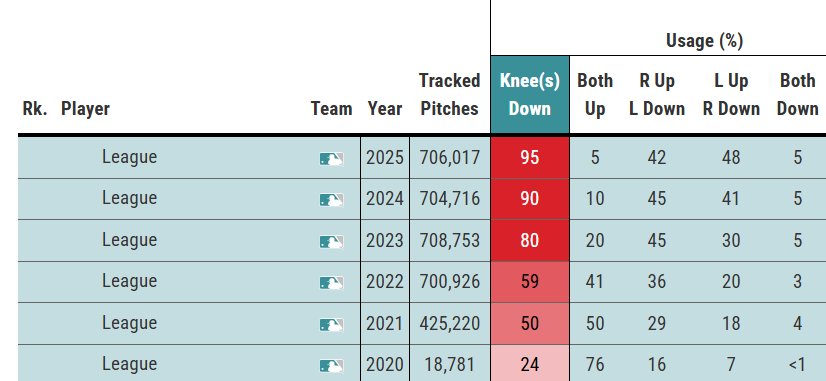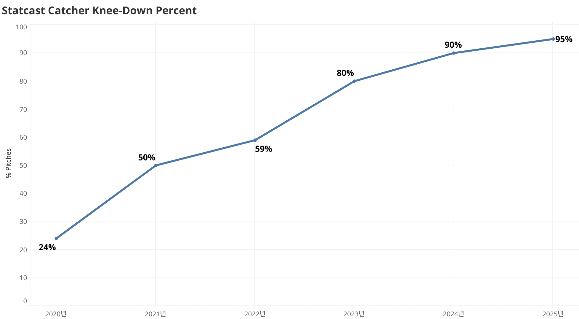 추가로 2025시즌 MLB 포수들은 약 49% 오른 무릎, 약 42% 왼 무릎을 굽혔다. 양쪽 무릎을 모두 대는 ‘both-knees-down’까지 포함하면 95%가 무릎을 땅에 대며 공을 받았다. 전통 자세는 약 5%에 불과했다.