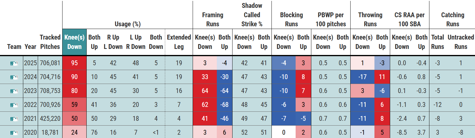 2022년엔 400타석을 채운 포수가 고작 9명이었다. 이는 불과 10년도 안 된 2014년의 22명에 비해 절반에도 못 미치는 수치였다. 20개 팀밖에 없었던 1967년에 기록한 8명 이래 최저치였다. 하지만 2025시즌엔 400타석을 넘기는 포수가 24명에 달했다. 한 무릎 자세에 모든 공을 돌리는 건 비약일 수 있지만, 이러한 변화에 영향을 미친 요소라는 것을 다소간 짐작할 수 있다.