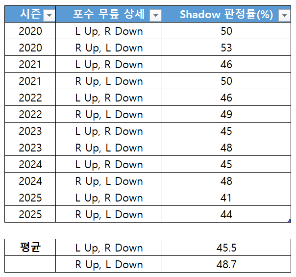 2020년부터 2025년까지 스트라이크존 가장자리(shadow 영역)에서 한 무릎 자세의 스트라이크 판정률은 48%로 45%인 both-knees-up 자세보다 3%P 높았다.