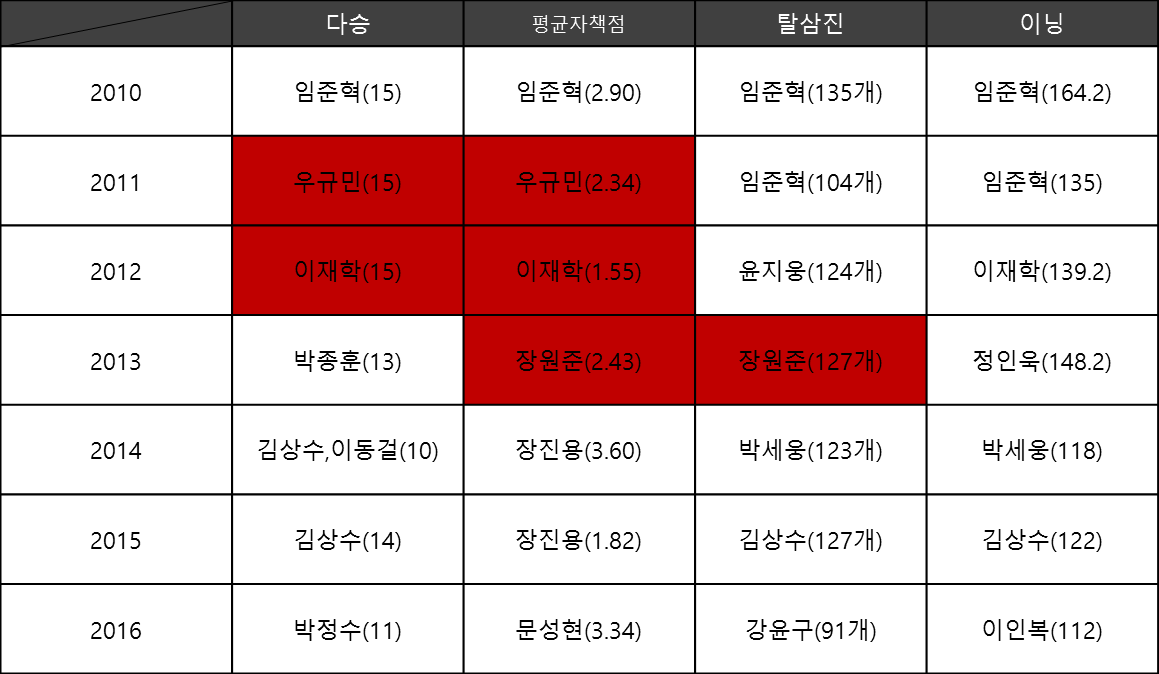 <2010~2016시즌 퓨처스리그 선발투수 주요 타이틀>