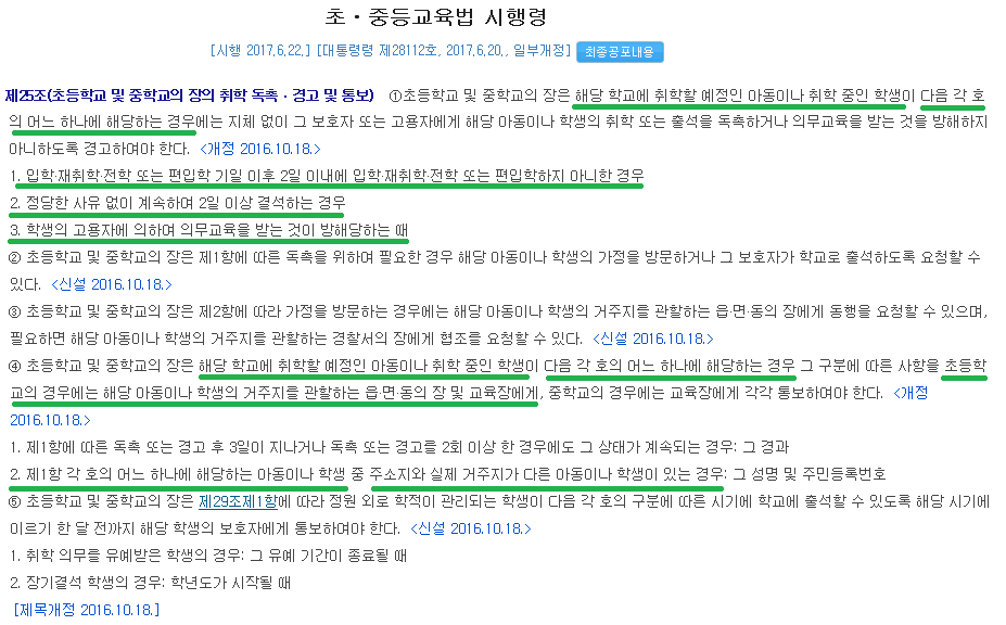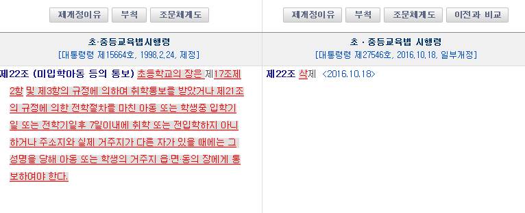 그런데 정부는 2016. 10. 18. 개정을 통해 취학통보를 받았거나 전학절차를 마친 아동 또는 학생 중 입학기일 또는 전학기일 후 7일 이내에 취학 또는 전·입학하지 아니한 경우(위의 ①의 경우)만 초·중등교육법 시행령 제25조 제4항으로 옮겨 규정하였고, 주소지와 실제 거주지가 다른 자가 있을 때(위의 ②의 경우)는 아예 삭제했습니다.