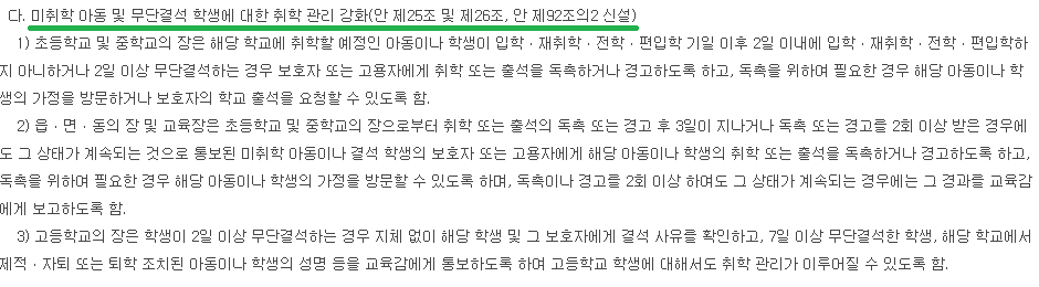 초·중등교육법 시행령 제25조 제1항은 「초등학교 및 중학교의 장은 해당 학교에 취학할 예정인 아동이나 취학 중인 학생이 다음 각 호의 어느 하나에 해당하는 경우」라고 규정하였고, 같은 항에서 1호 내지 3호로 「1. 입학·재취학·전학 또는 편입학 기일 이후 2일 이내에 입학·재취학·전학 또는 편·입학하지 아니한 경우, 2. 정당한 사유 없이 계속하여 2일 이상 결석하는 경우, 3. 학생의 고용자에 의하여 의무교육을 받는 것이 방해 당하는 때」라고 규제하였습니다.