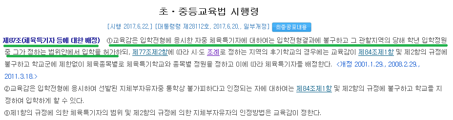 또 한 가지 문제는 중ㆍ고등학교와 달리 초등학교 체육특기자에 대해서는 특별 배정에 대한 규정이 없다는 점입니다. 초ㆍ중등교육법 시행령 제68조 제1항은 「지역별·학교군별 추첨에 의하여 중학교의 입학지원자가 입학할 학교를 배정」할 것을 규정하고 있습니다. 다만 초ㆍ중등교육법 시행령 제69조 제1항은 「교육장은 제68조의 규정에 불구하고 체육특기자에 대하여 당해 교육장 관할지역의 당해 학년 입학정원 중 교육감이 정하는 범위 안에서 입학하게 할 수 있다. 이 경우 체육특기학교와 종목별 정원은 교육장이 지정하여 배정한다.」고 규정하여 ‘체육특기자’에 대한 배정을 별도로 규정하고 있습니다. 고등학교의 경우에도 제87조에서 ‘체육특기자’에 대한 배정을 별도로 규정하고 있습니다. 그러나 초등학교의 경우 이러한 규정이 존재하지 않습니다.