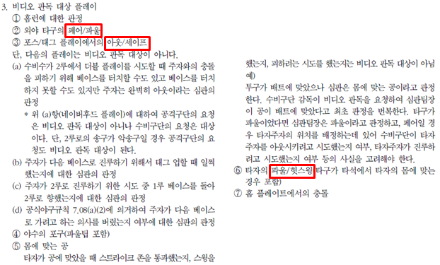‘타자의 파울/헛스윙’에서 슬래쉬(/)가 혼동을 주기 때문이다. 규정 내 다른 문항들 중 슬래쉬(/)가 붙어있는 항목에서는 전자와 후자의 상황으로 나뉠 때만 판독 대상이 가능하다는 것처럼 기술돼있다. 즉 ②호와 ③호처럼 ⑥호도 해당 상황이 파울이냐 헛스윙이냐를 판단하는 경우에 대한 것이지, ‘파울’과 ‘헛스윙’ 등 개별사안으로 판독할 수 있는 것은 아니라는 점이다. 그 외 나머지 항목들에서도 볼 수 있듯 개별적으로 다루는 것은 따로 구분이 되어 있다. 신체의 닿는 타구가 파울이냐 아니냐(페어 혹은 방해), 배트에 스쳤냐 아니냐(볼, 스트라이크, 인플레이 여부)도 가능하게 하려면 ‘⑥타구가 타석에서 타자의 몸에 맞는 파울, ⑦타자의 배트에 닿음’으로 나눴어야 했다.