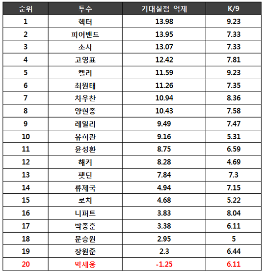 ERA 상위 선발투수20인 기대실점 억제력 순위