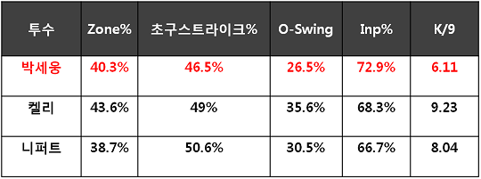 켈리와 니퍼트는 Zone% 하위에 위치해 있지만 볼 카운트 싸움은 박세웅보다 효율적으로 해냈다. 이 두 명의 투수를 박세웅과 비교해보자.
