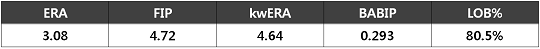 BABIP 역시 리그 평균에 비해 낮은 편인데, 땅볼비율이 높다는 점을 감안하면 향후 오를 가능성을 배제할 수 없다. 여기에 잔루율(LOB%)은 80.5%로 리그 1위이다. 잔루율은 대부분의 경우 70%대로 회귀하는 경향성이 커 계속 유지되기 어렵다.