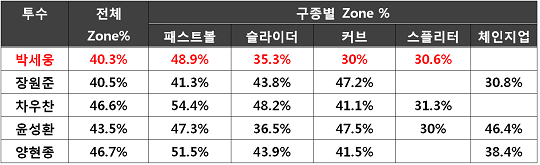 결국 장기적으로 볼 때 그는 탈삼진 능력을 개선하거나 존 점유율을 높일 필요가 있다. 그러나 이번 시즌에는 탈삼진 능력 보다는 완급조절에 초점을 맞춘 모습이기 때문에, 존 점유율을 높이는 것이 보다 현실적인 방안이다. 그렇다면 어떤 구종에서 존 점유율을 높일 수 있을까? 해법을 찾기 위해 박세웅을 비롯해 규정이닝을 채운 토종 ERA 5위권 투수들을 비교해봤다.