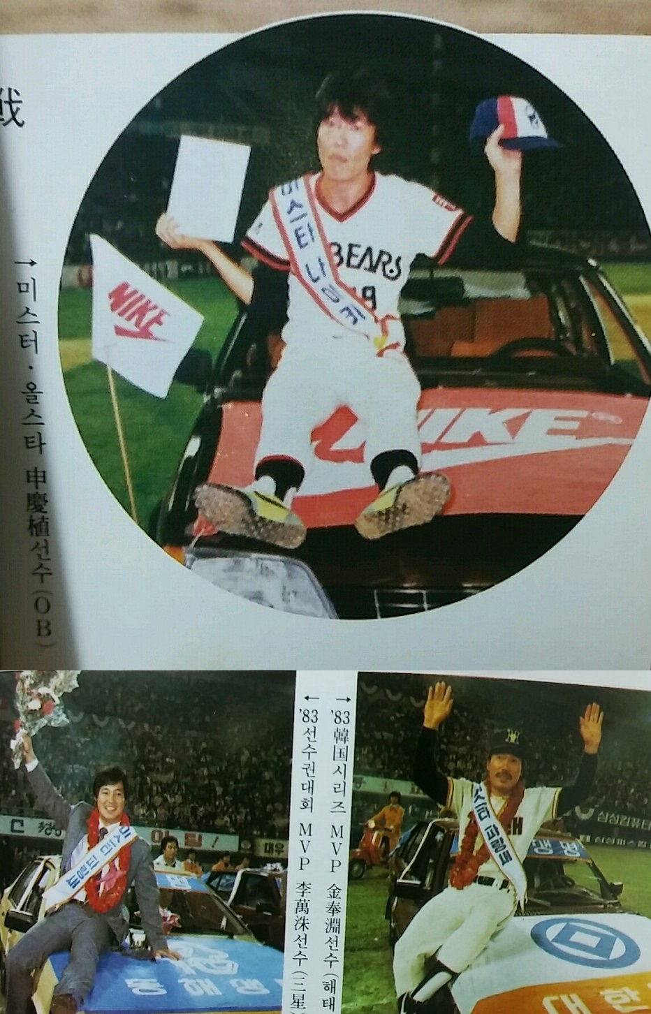 <위부터 시계방향으로 1983년 올스타, 한국시리즈, 정규시즌 MVP인 신경식, 김봉연, 이만수. 미스타 나이키, 미스터 파랑새라고 쓰인 띠를 두르고 있다.>