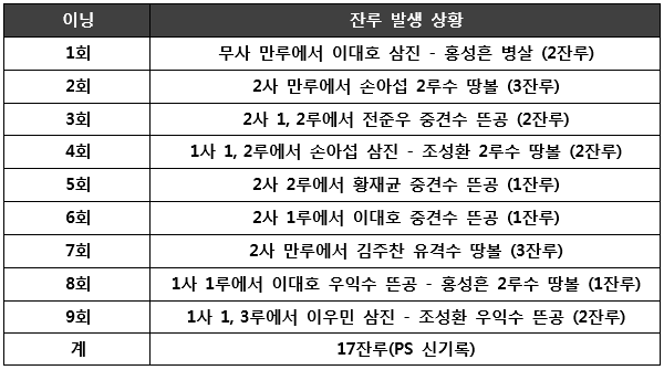 또 잔루를 너무 많이 남겼다. 포스트시즌 잔루 신기록(17잔루)을 세웠던 2010 준플레이오프 4차전이 대표적이다. 2008년 준플레이오프 1차전, 2010년 준플레이오프 3차전, 2011년 플레이오프 5차전에서 벌어진 난동과 오물 투척 같은 사례들은 이러한 가을야구 잔혹사에 방점을 찍은 ‘데코레이션’이라 볼 수 있겠다.