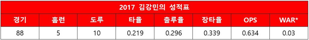 올 시즌 그의 역할은 대타∙대수비∙대주자에 한정됐는데, 김강민이 기록한 시즌 WAR은 0.03은 정확히 ‘대체선수’ 수준에 불과했다. 김강민의 연봉에 비하면 많이 아쉬우나 그나마 다행인 것은 김강민과의 계약이 내년을 끝으로 만료된다는 점이다.