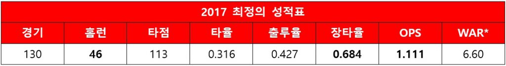 작년 테임즈와 함께 공동 홈런왕에 오르며 토종 거포의 자존심을 지켰던 최정은 올해 46홈런으로 리그 유일의 40홈런 타자로 우뚝 섰고 2년 연속 40홈런-100타점을 기록했다. 또한 구단 역사상 단일시즌 최다 홈런∙타점을 올린 타자로 자리매김하며 역대 3루수 단일시즌 최다 홈런 기록까지 경신했다(종전 페르난데스 45홈런).