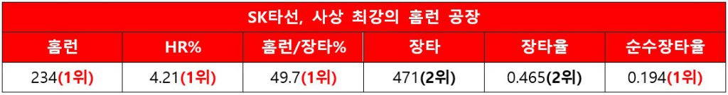 작년 182홈런으로 단일시즌 팀 홈런 기록을 경신한 SK는 올해 더욱 강한 대포군단의 위용을 보여줬다. 시즌 초반부터 팀 홈런 1위로 치고 나가더니 시즌 끝까지 정상을 내주지 않았다. 특히 전반기 마감 당시 다른 구단들이 100홈런도 넘지 못한 상황(2위 두산, KIA 99홈런)에서 SK는 153홈런을 기록해 한 차원 높은 홈런 생산력을 보였다. 결국 올 시즌 SK의 최종 팀 홈런 수는 234개로, 역대 단일시즌 팀 최다 홈런 신기록을 다시 한번 갈아치웠다. 4.21%의 홈런 비율도 역대 최고 수치다(종전 2003년 삼성 – 213홈런, 4.06 HR%).