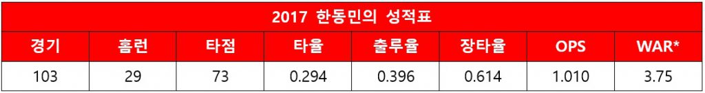 하지만 올시즌 보여준 한동민의 퍼포먼스는 그가 내년에 건강하게 복귀한다면 SK 홈런 군단의 차세대 리더가 될 수 있음을 증명했다. 한동민이 103경기 동안 출전하면서 쌓은 WAR은 3.75로, 풀타임 출전을 가정 시 리그 10위 안에 들 수 있는 페이스다.