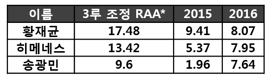 표1. 2015~2016 3루 조정 RAA* TOP 3 / 70경기 이상 선발출장 기준